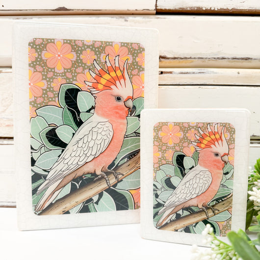 This gorgeous bird is a raucous icon of the Australian bush. Sharing the good looks, both males & females have a similar crest that pops up when attracting a mate or in excitement or danger to make them look bigger. Pink Cockatoos mate for life and live for up to 70 years, settling in the hollow of old trees and noisily bringing up their family together in matrimonial harmony.